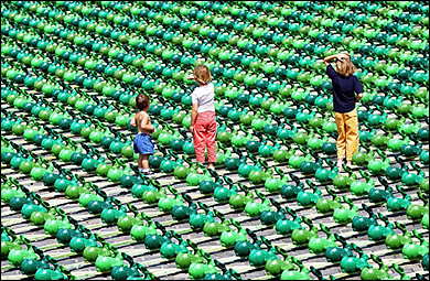Plastic rabbits : Children wander through an exhibit by Ottmar Hoerl made of 7,000 plastic green rabbits in Nuremberg, Germany. (AFP)